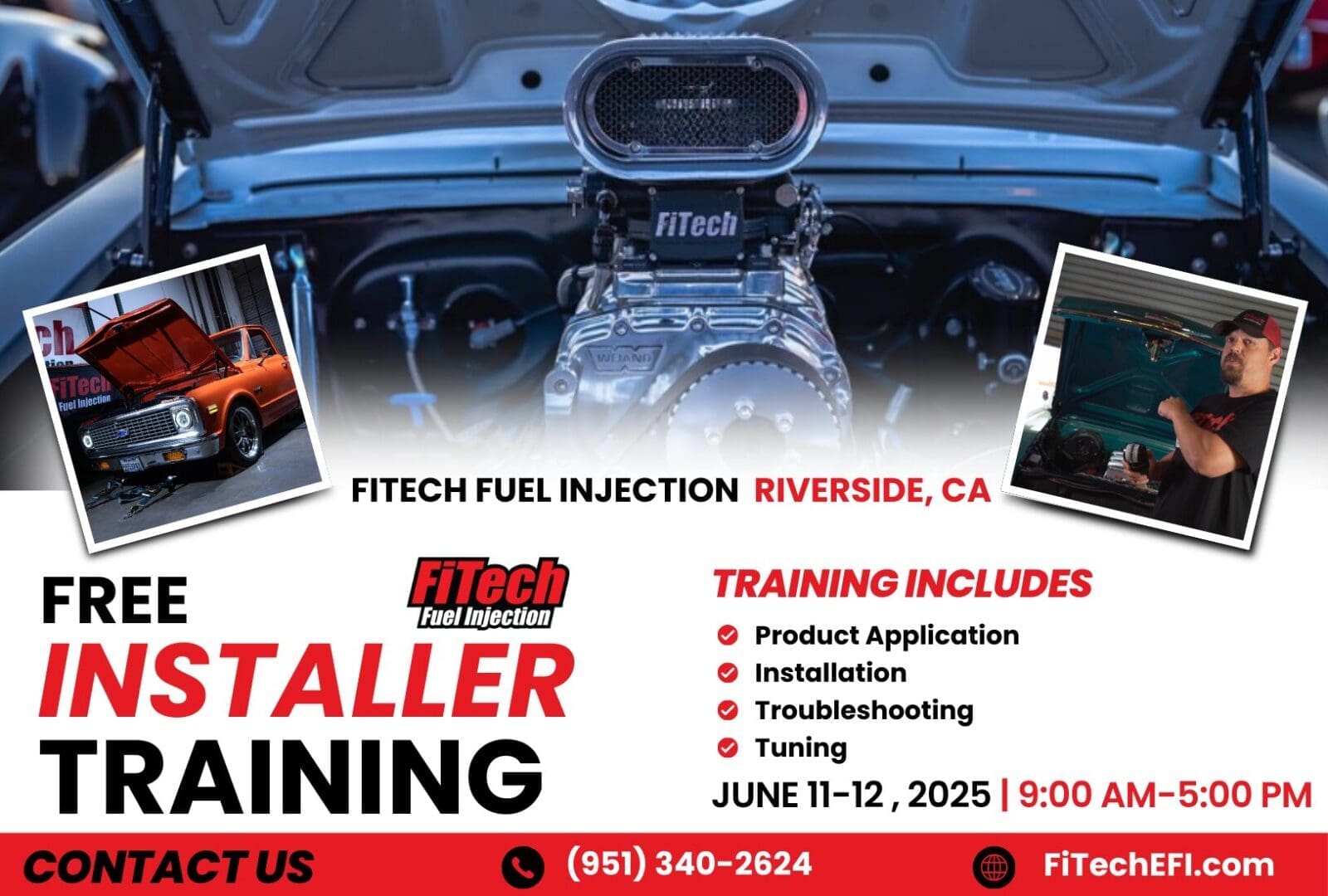 FiTech Installer Training – September 10–11, 2025 Join us at FiTech Fuel Injection in Riverside, CA for our FREE Installer Training Event! Whether you’re new to fuel injection or looking to sharpen your skills, this hands-on training is designed to help professional installers confidently set up, tune, and troubleshoot FiTech EFI systems. 📅 Event Details: Dates: September 10–11, 2025 (2-day session) Time: 9:00 AM - 5:00 PM Location: FiTech Fuel Injection, Riverside, CA Cost: FREE (Registration required)