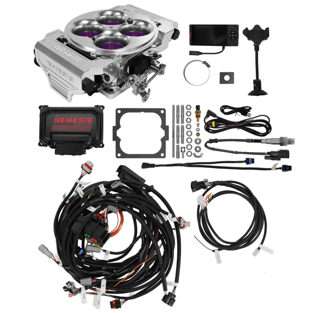 The Nemesis is a complete EFI system. Each kit comes fully equipped with 8 injectors, dual IAC motors, a primary shaft TPS, 3-bar TMAP compatibility, ECU, wiring harness, and all essential sensors—everything required to control up to 1600 HP* with confidence.
