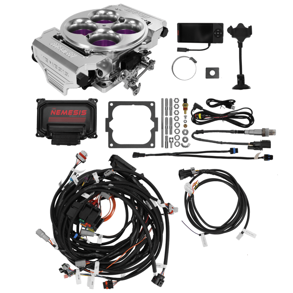 The Nemesis is a complete EFI system. Each kit comes fully equipped with 8 injectors, dual IAC motors, a primary shaft TPS, 3-bar TMAP compatibility, ECU, wiring harness, and all essential sensors—everything required to control up to 1600 HP* with confidence.