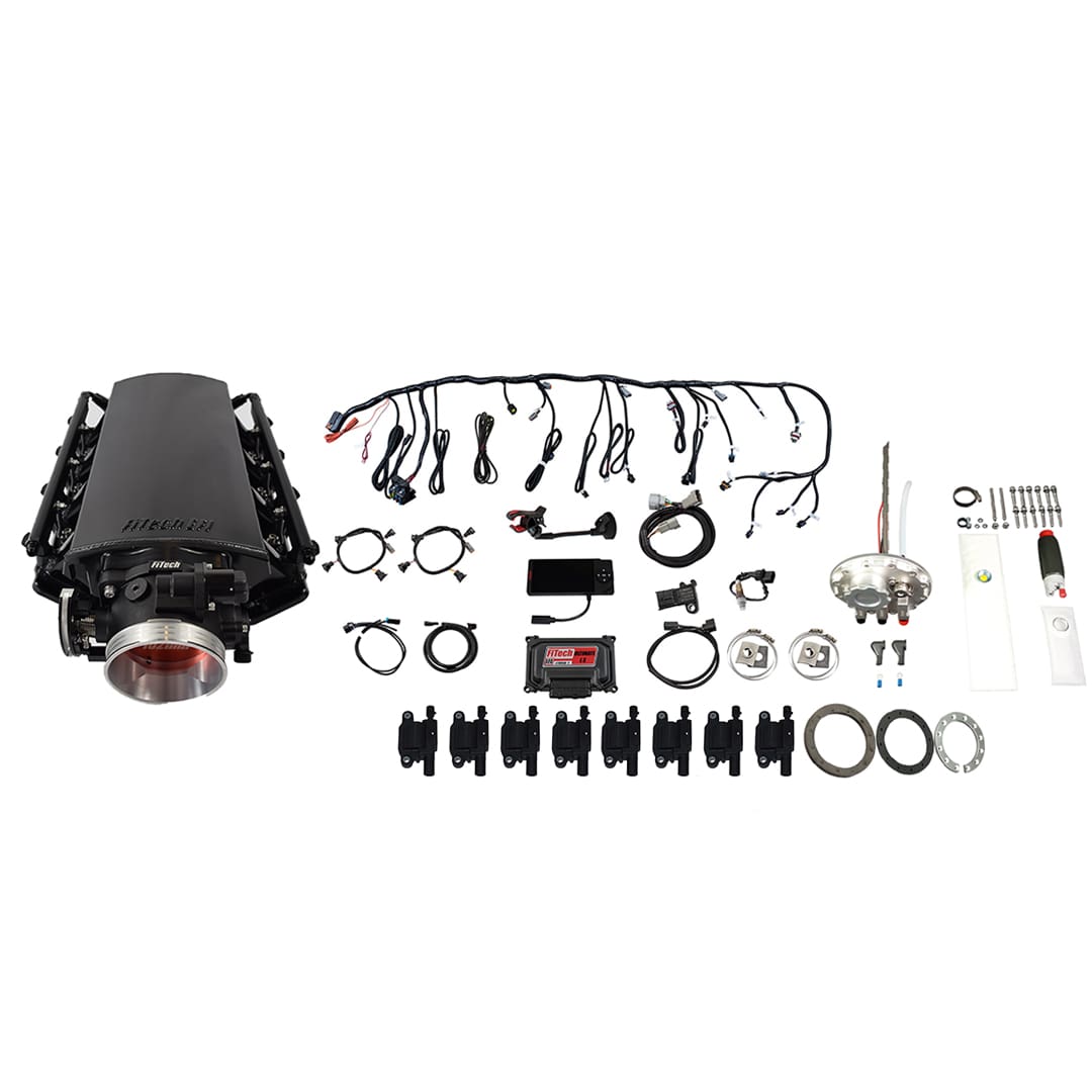 Ultimate LS 500 HP EFI System With Short Cathedral Intake, Transmission Control, Go Fuel In-Tank 340 LPH Fuel Pump Returnless Module With 2 Inch Fill & Go Spark LS3 Style Coil With LED 8 Pack Master Kit
